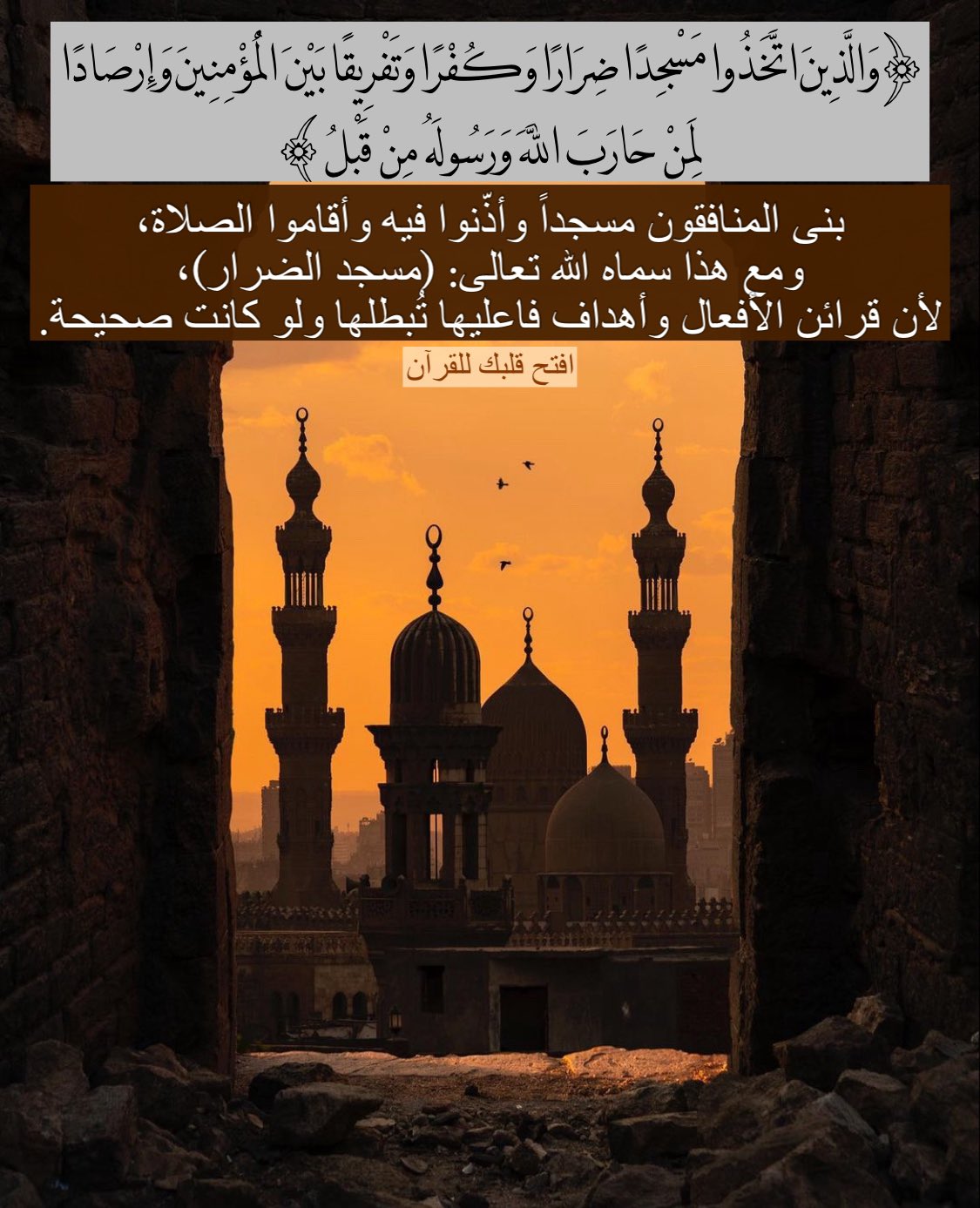 ﴿وَالَّذِينَ اتَّخَذُوا مَسْجِدًا ضِرَارًا وَكُفْرًا وَتَفْرِيقًا بَيْنَ الْمُؤْمِنِينَ وَإِرْصَادًا لِّمَنْ حَارَبَ اللَّهَ وَرَسُولَهُ مِن قَبْلُ﴾
