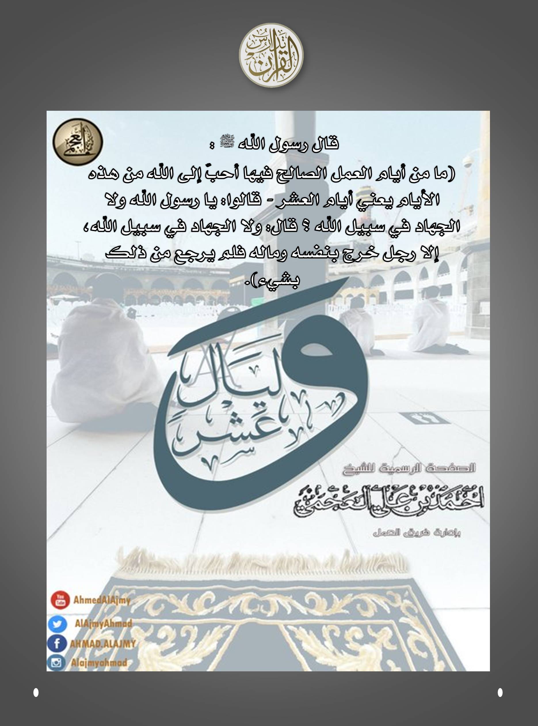 قال النبيّ (ﷺ): «ما مِن أيَّامٍ أعظمُ عِندَ اللهِ ولا أحَبُّ إليه مِن العَملِ فيهنَّ مِن هذه الأيَّامِ العَشرِ؛ فأَكْثِروا فيهِنَّ مِن التَّهليلِ، والتَّكبيرِ، والتَّحْمِيد».
