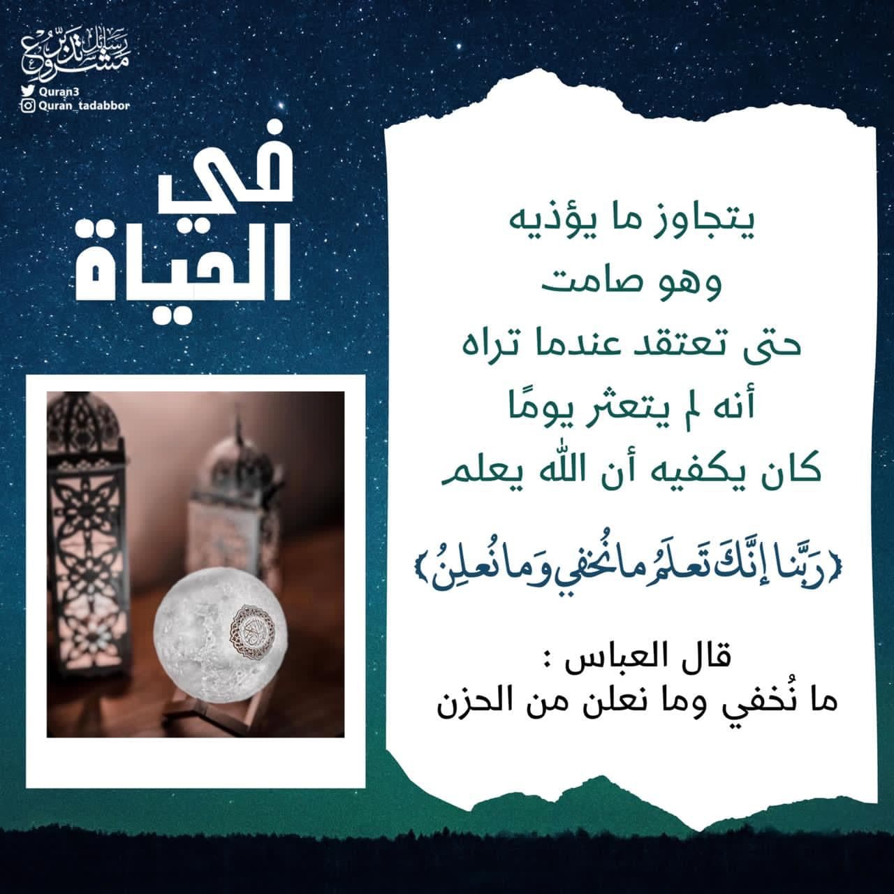 في الحياة •• يتجاوز ما يؤذيه وهو صامت حتى تعتقد عندما تراه أنه لم يتعثر يوماً، كان يكفيه أن الله يعلم."* ‏﴿رَبَّنا إِنَّكَ تَعلَمُ ما نُخفي وَما نُعلِنُ﴾ ‏قال العباس ما نُخفي وما نعلن من الحزن