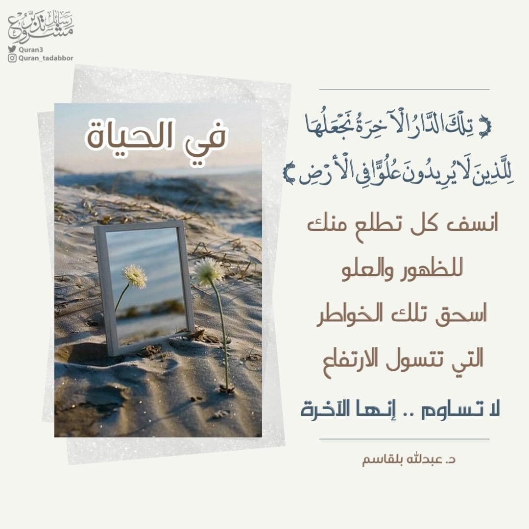 في الحياة ( تِلْكَ الدَّارُ الْآخِرَةُ نَجْعَلُهَا لِلَّذِينَ لَا يُرِيدُونَ عُلُوًّا فِي الْأَرْضِ) انسف كل تطلع منك للظهور والعلو .. اسحق تلك الخواطر التي تتسول الارتفاع لا تساوم إنها الآخرة
