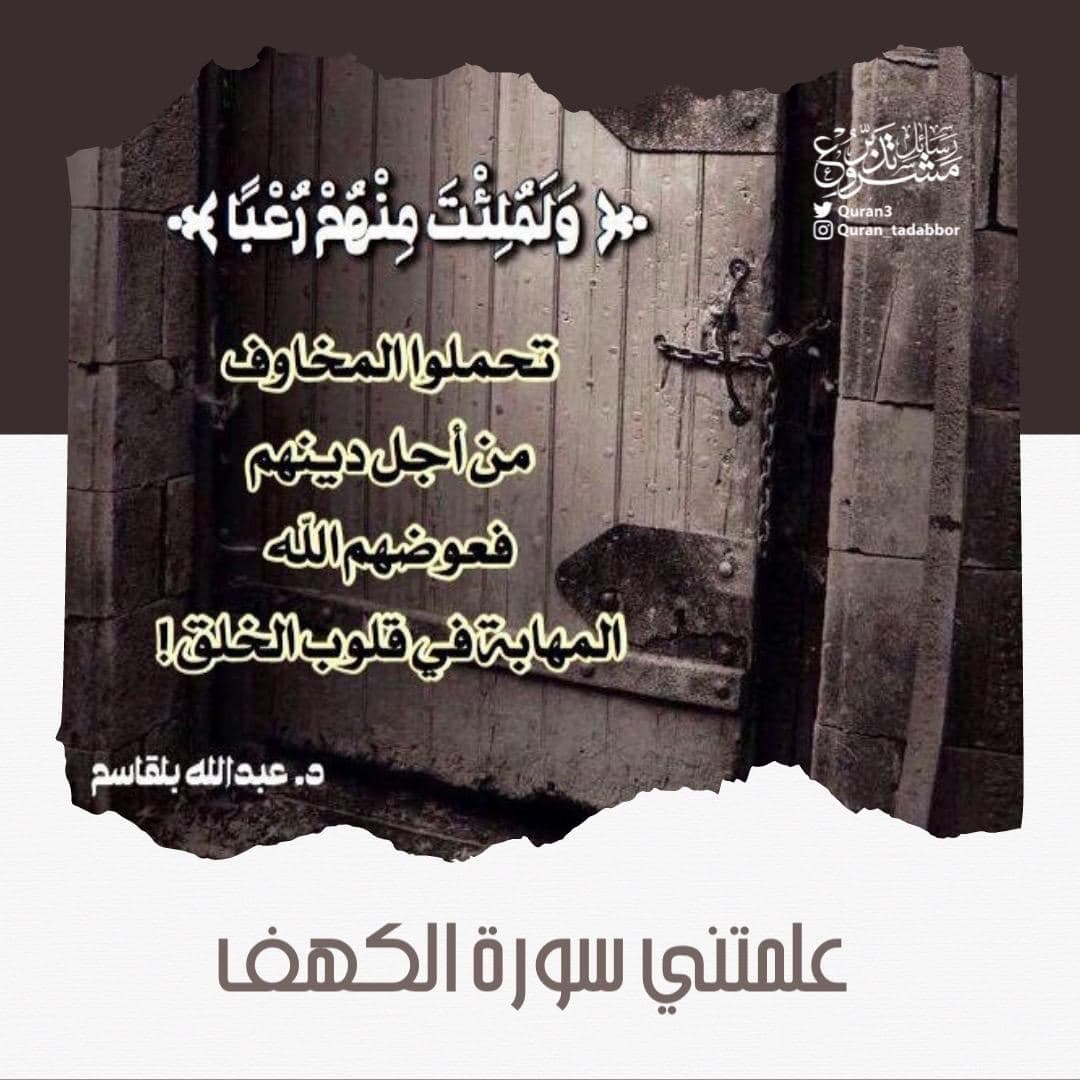 علمتني سورة الكهف ‏﴿ وَلَمُلِئْتَ مِنْهُمْ رُعْبًا ﴾ ‏تحملوا المخاوف من أجل دينهم فعوضهم الله المهابة في قلوب الخلق