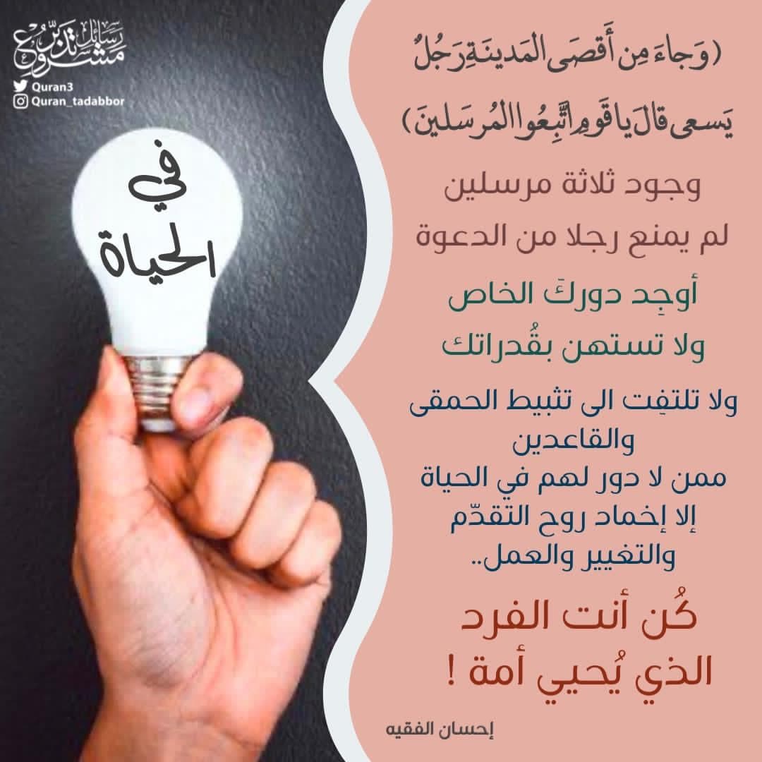 في الحياة ‏‌﴿ وَجاءَ مِن أَقصَى المَدينَةِ رَجُلٌ يَسعى قالَ يا قَومِ اتَّبِعُوا المُرسَلينَ ﴾ وجود ثلاثة مرسلين لم يمنع رجلا من الدعوة. أوجِد دوركَ الخاص ولا تستهن بقُدراتك ولا تلتفِت الى تثبيط... المزيد