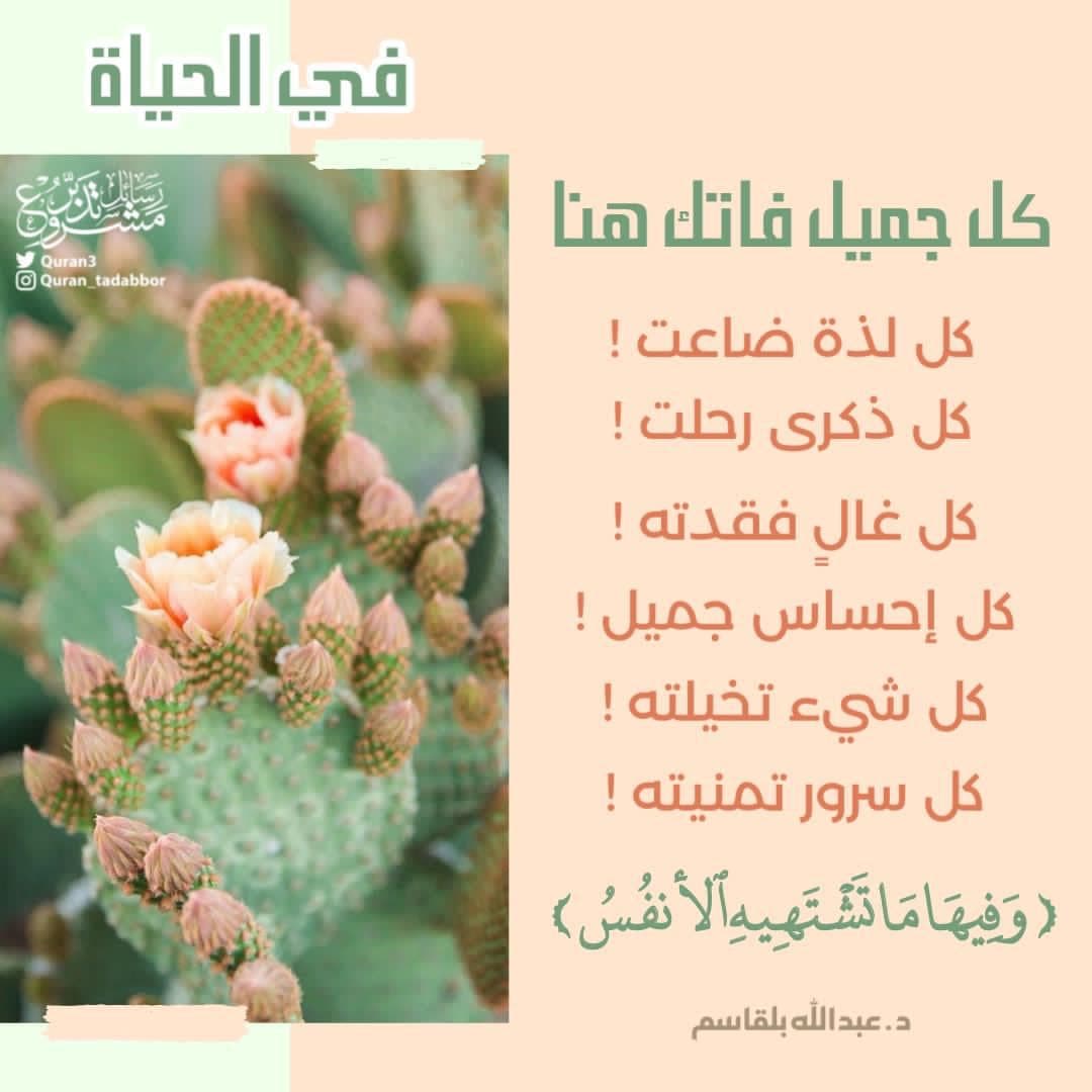 في الحياة كل جميل فاتك هنا ‏كل لذة ضاعت ‏كل ذكرى رحلت ‏كل غالٍ فقدته ‏كل إحساس جميل ‏كل شيء تخيلته ‏كل سرور تمنيته ‏(وَفِيهَا مَا تَشْتَهِيهِ ٱلْأَنفُسُ)