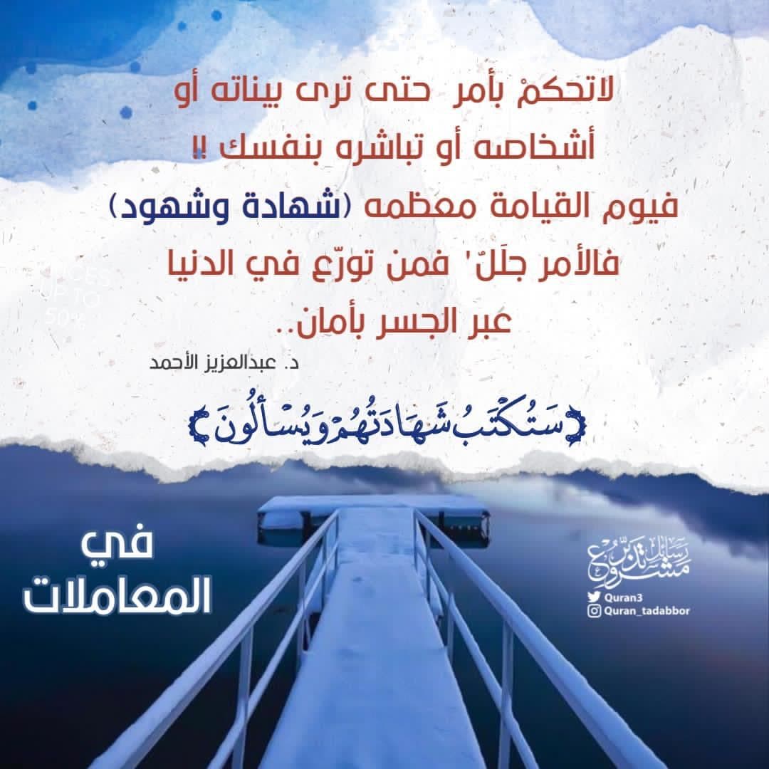 في المعاملات لاتحكمْ بأمر حتى ترى بيناته أو أشخاصه أو تباشره بنفسك ‏فيوم القيامة معظمه' شهادة وشهود' فالأمر جلَلٌ' فمن تورّع في الدنيا ‏عبر الجسر بأمان د. عبدالعزيز الأحمد ( سَتُكْتَبُ شَهَادَتُهُمْ وَيُسْأَلُونَ )