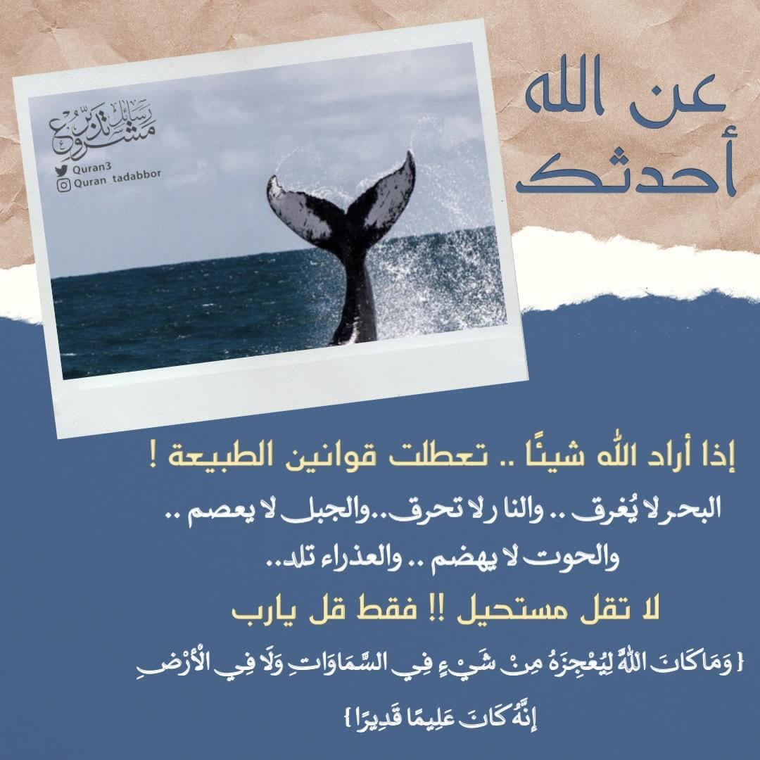 عن الله أحدثك ‏إذا أراد الله شيئاً .. تعطلت قوانين الطبيعة ‏البحر لا يُغرق ، والنار لا تحرق ، والجبل لا يعصم ، والحوت لا يهضم ، والعذراء تلد. ‏لا تقل مستحيل فقط قل يارب {وَمَا كَانَ اللَّهُ لِيُعْجِزَهُ مِنْ شَيْءٍ فِي السَّمَاوَاتِ وَلَا فِي الْأَرْضِ إِنَّهُ كَانَ عَلِيمًا قَدِيرًا}
