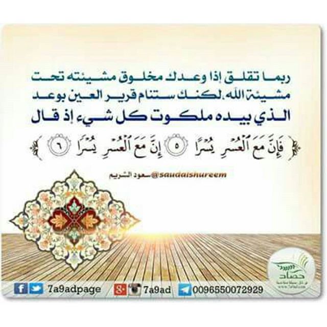 ربما تقلق اذا وعدك مخلوق مشيئته تحت مشيئة الله لكنك ستنام قرير العين بوعد الذي بيده ملكوت كل شىء اذ قال ﴿فَإِنَّ مَعَ الْعُسْرِ يُسْرًا ﴿إِنَّ مَعَ الْعُسْرِ يُسْرًا