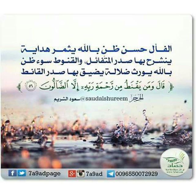 الفأل حسن ظنٍ بالله يثمر هداية ينشرح به الصدر والقنوط سوء ظن بالله يورث ضلالة يضيق به الصدر ﴿ومن يقنط من رحمة ربه إﻻ الضالون﴾.