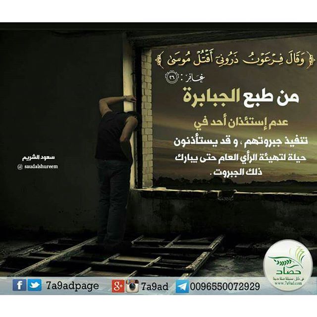 طبع الجبابرة : عدم استئذان احد في تنفيذ جبروتهم ، وقد يستأذنون حيلة لتهيئة الراي العام ، حتي يبارك ذلك الجبروت.