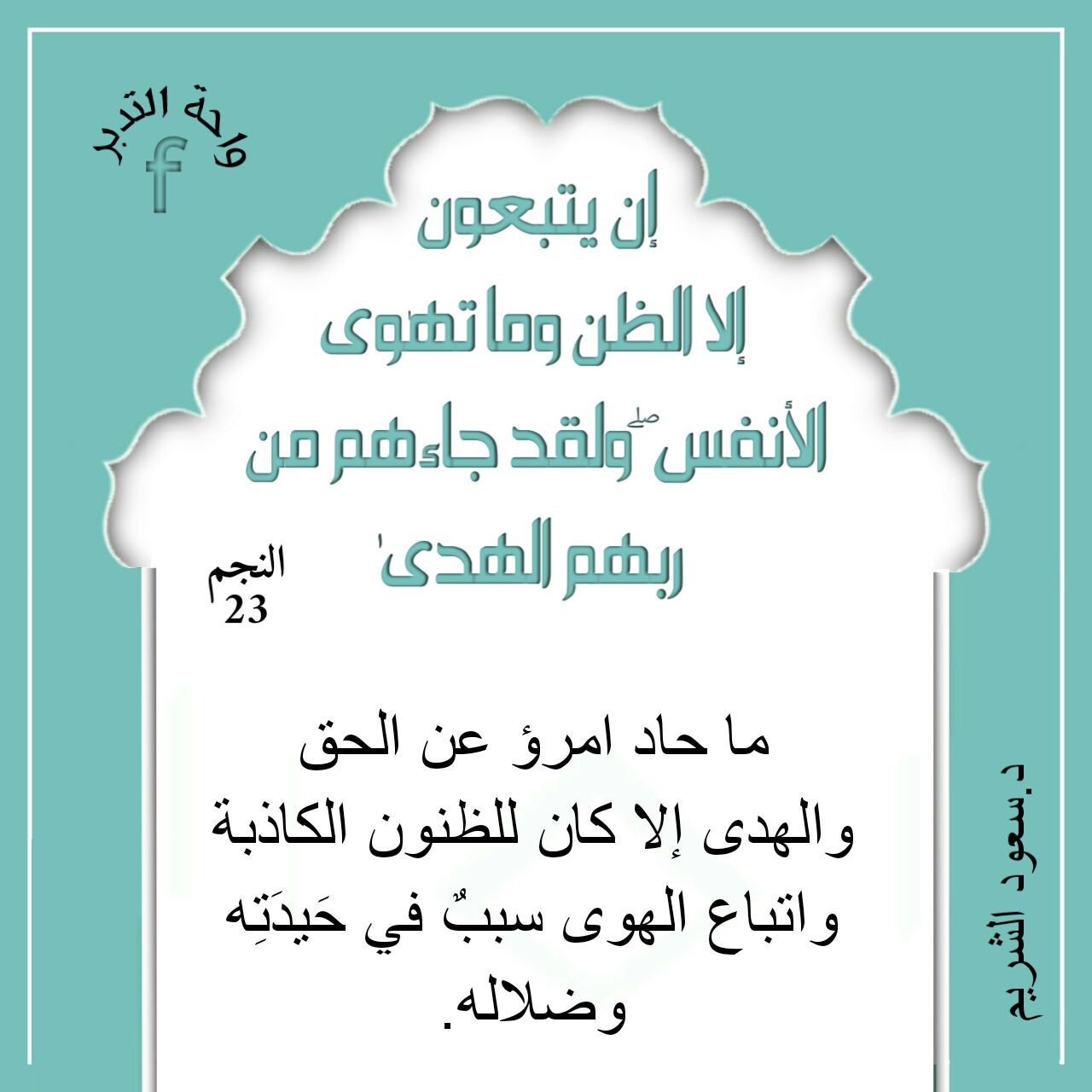 ما حاد امرؤ عن الحق والهدى إلا كان للظنون الكاذبة واتباع الهوى سببٌ في حَيدَتِه وضلاله: (إِن يَتَّبِعُونَ إِلَّا الظَّنَّ وَمَا تَهْوَى الْأَنفُسُ وَلَقَدْ جَاءَهُم مِّن رَّبِّهِمُ الْهُدَىٰ).