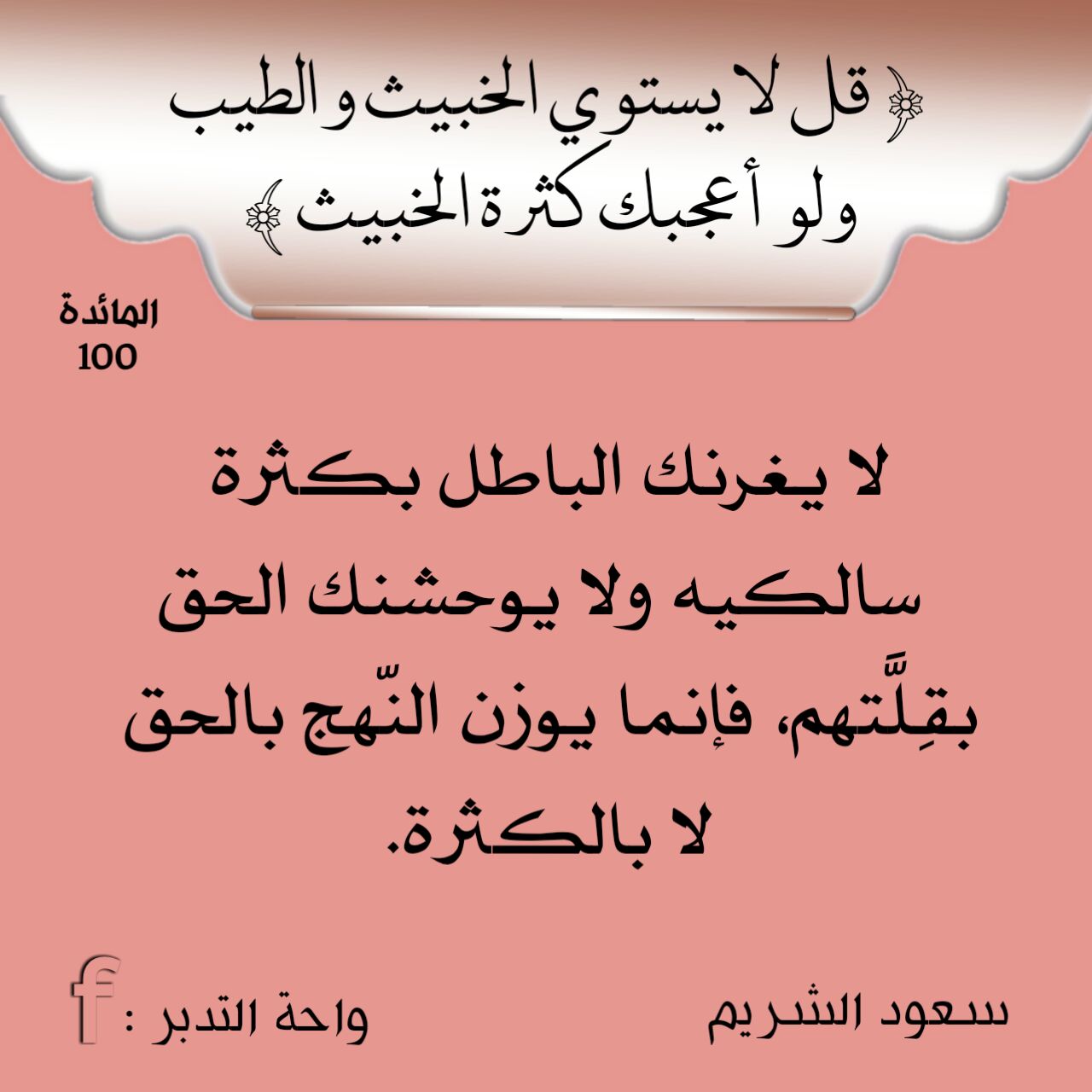 ﴿قُل لَّا يَسْتَوِي الْخَبِيثُ وَالطَّيِّبُ وَلَوْ أَعْجَبَكَ كَثْرَةُ الْخَبِيثِ﴾: ‏لا يغرنك الباطل بكثرة سالكيه ولا يوحشنك الحق بقِلَّتهِم، فإنما يوزن النّهج بالحق لا بالكثرة.