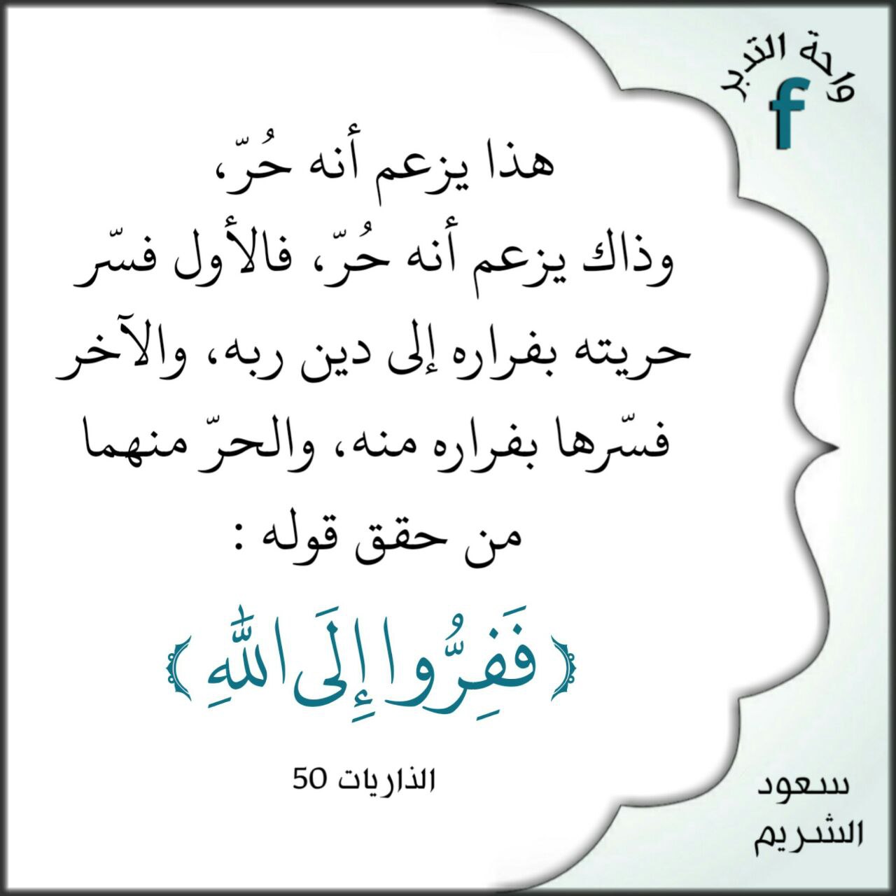 ﴿فَفِرُّوا إِلَى اللَّهِ﴾: ‏هذا يزعم أنه حُرّ، وذاك يزعم أنه حُرّ، فالأول فسّر حريته بفراره إلى دين ربه، والآخر فسّرها بفراره منه، والحرّ منهما من حقق قوله: {ففروا إلى الله}.