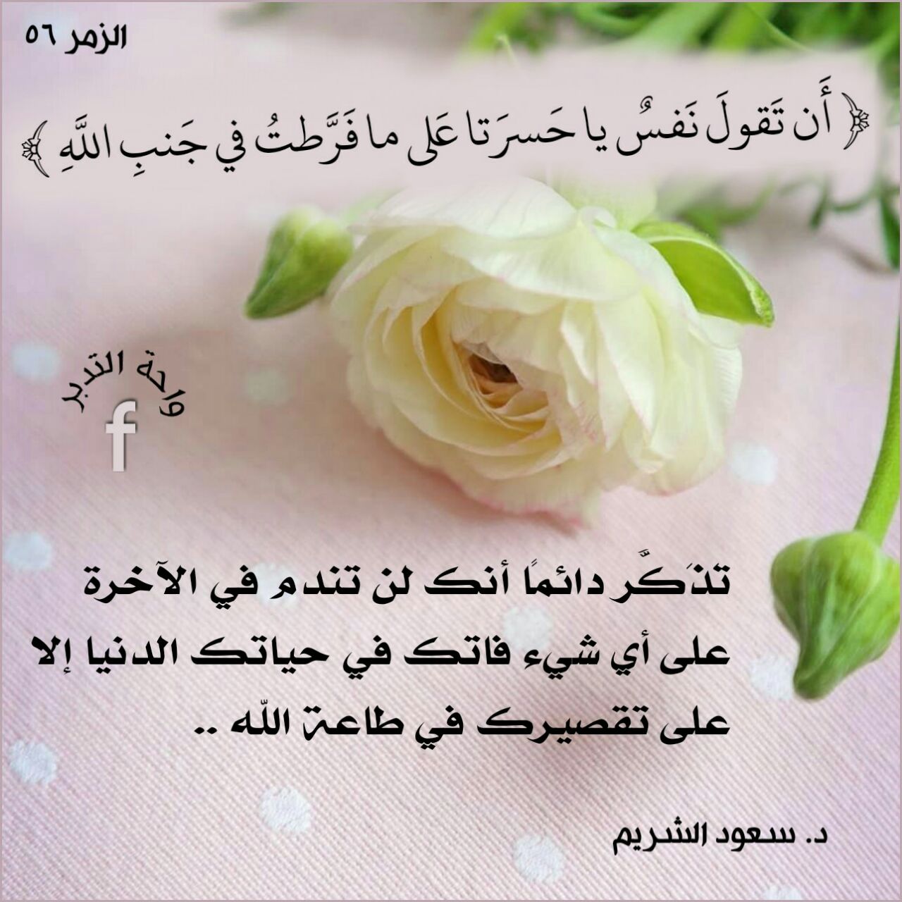﴿أَن تَقُولَ نَفْسٌ يَا حَسْرَتَا عَلَى مَا فَرَّطتُ فِي جَنبِ اللَّهِ﴾: تذكر دائمًا أنك لن تندم في اﻵخرة على أي شيء فاتك في حياتك الدنيا إلا على تقصيرك في طاعة الله.