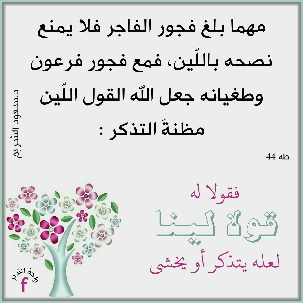 ﴿فَقُولَا لَهُ قَوْلًا لَّيِّنًا لَّعَلَّهُ يَتَذَكَّرُ أَوْ يَخْشَى﴾: ‏مهما بلغ فجور الفاجر فلا يمنع نصحه باللّين، فمع فجور فرعون وطغيانه جعل الله القول اللّين مظنةَ التذكر: (فقولا له قولا لينا لعله يتذكر أو يخشى).