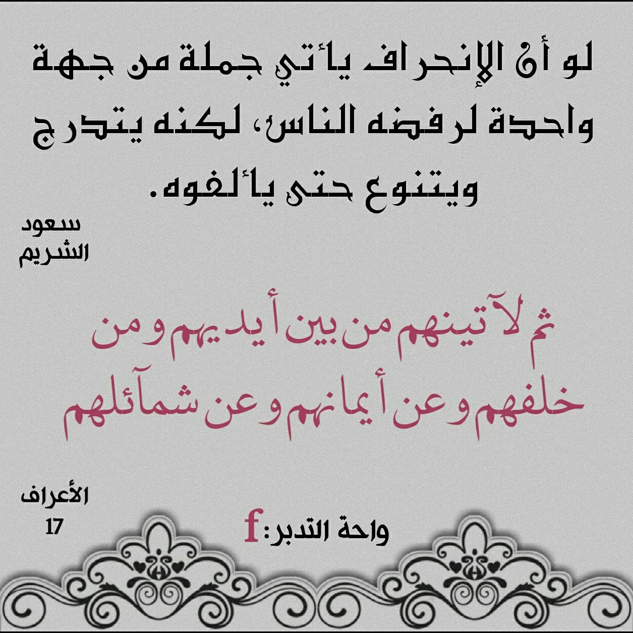 ﴿ثُمَّ لَآتِيَنَّهُم مِّن بَيْنِ أَيْدِيهِمْ وَمِنْ خَلْفِهِمْ وَعَنْ أَيْمَانِهِمْ وَعَن شَمَائِلِهِمْ﴾: ‏لو أن الانحراف يأتي جملة من جهة واحدة لرفضه الناس، لكنه يتدرج ويتنوع حتى يألفوه: (ثم لآتينهم من بين أيديهم ومن خلفهم وعن أيمانهم وعن شمائلهم).