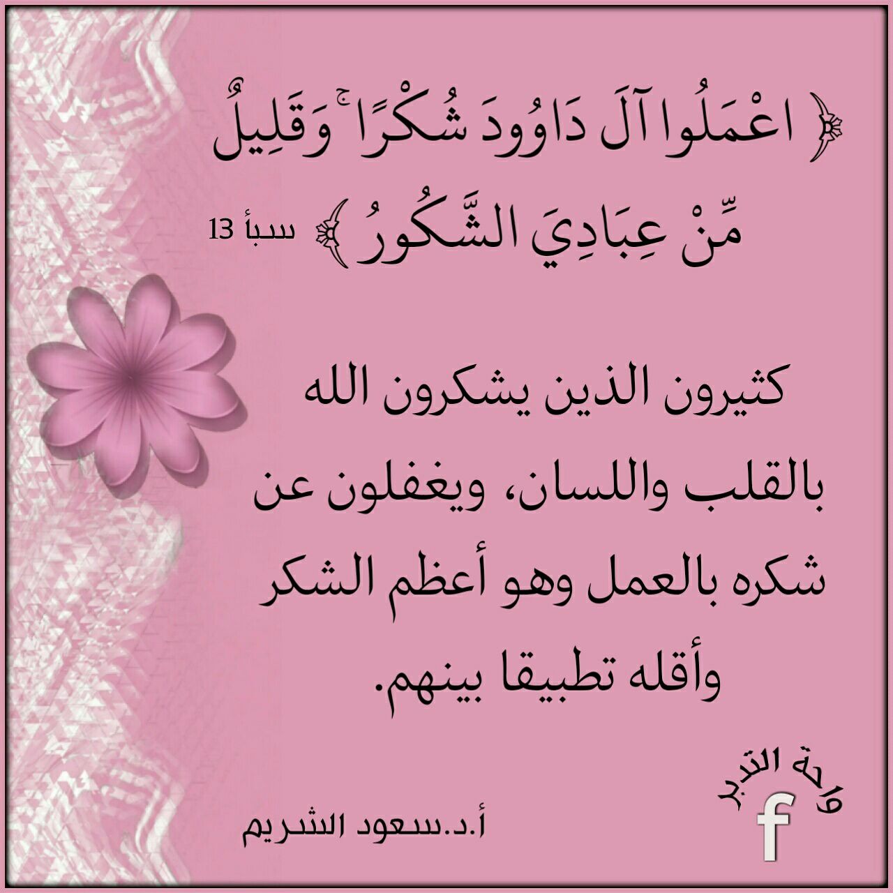 ﴿اعْمَلُوا آلَ دَاوُدَ شُكْرًا وَقَلِيلٌ مِّنْ عِبَادِيَ الشَّكُورُ﴾: كثيرون الذين يشكرون الله بالقلب واللسان، ويغفلون عن شكره بالعمل وهو أعظم الشكر وأقله تطبيقا بينهم.