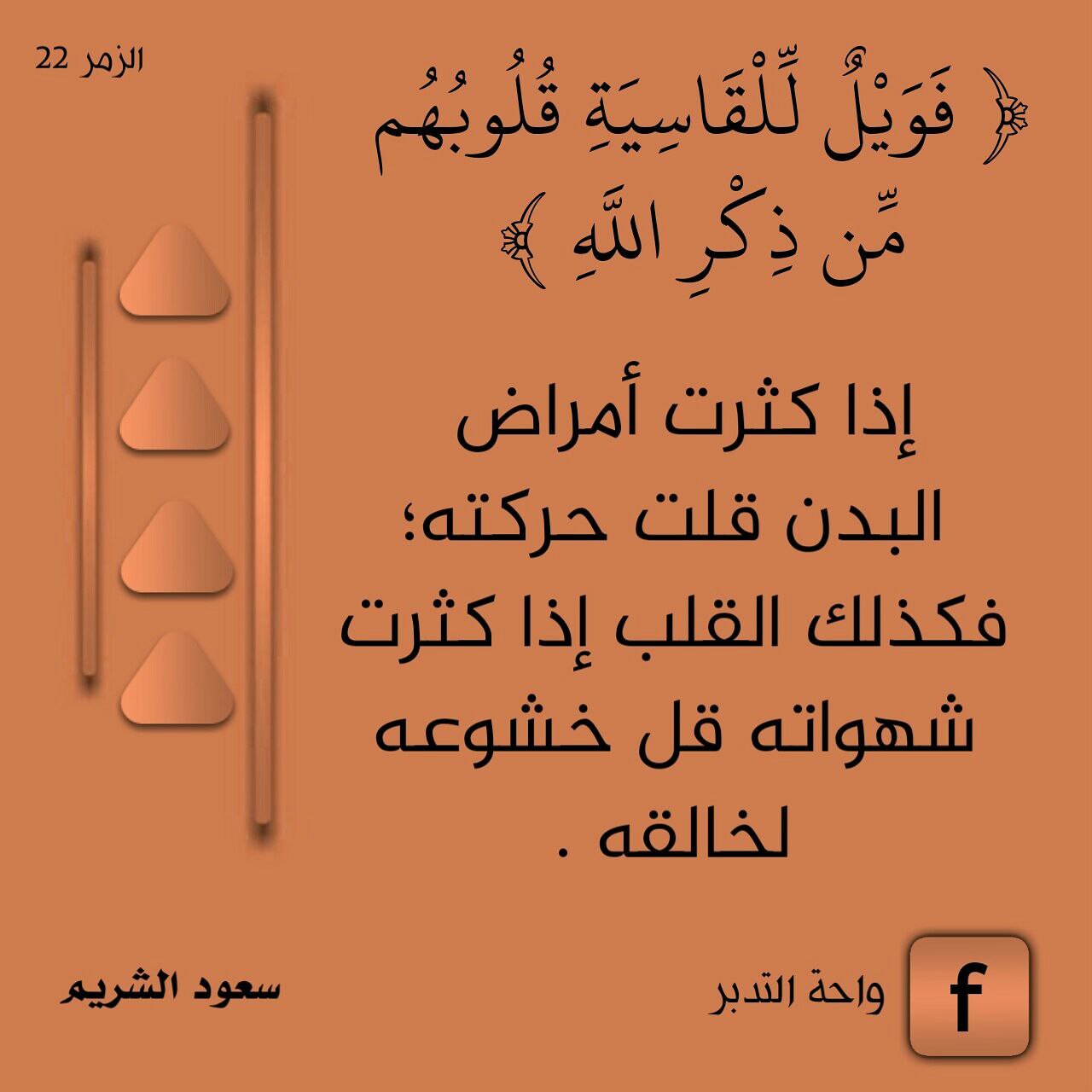 ﴿فَوَيْلٌ لِّلْقَاسِيَةِ قُلُوبُهُم مِّن ذِكْرِ اللَّهِ﴾: إذا كثرت أمراض البدن قلت حركته؛ فكذلك القلب إذا كثرت شهواته قل خشوعه لخالقه.