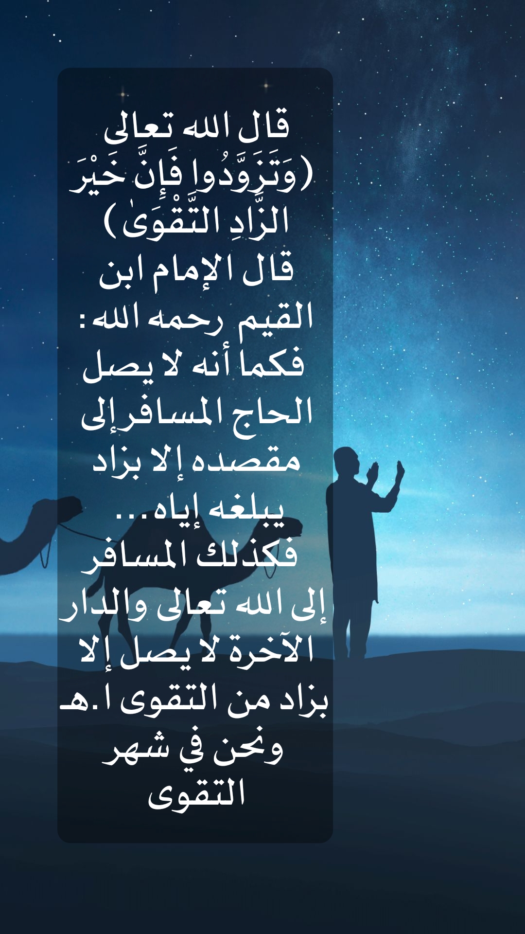 قال الله تعالى ( وَتَزَوَّدُوا فَإِنَّ خَيْرَ الزاد التقوى ) قال الإمام ابن القيم رحمه الله : فكما أنه لا يصل الحاج المسافر إلى مقصده إلا بزاد