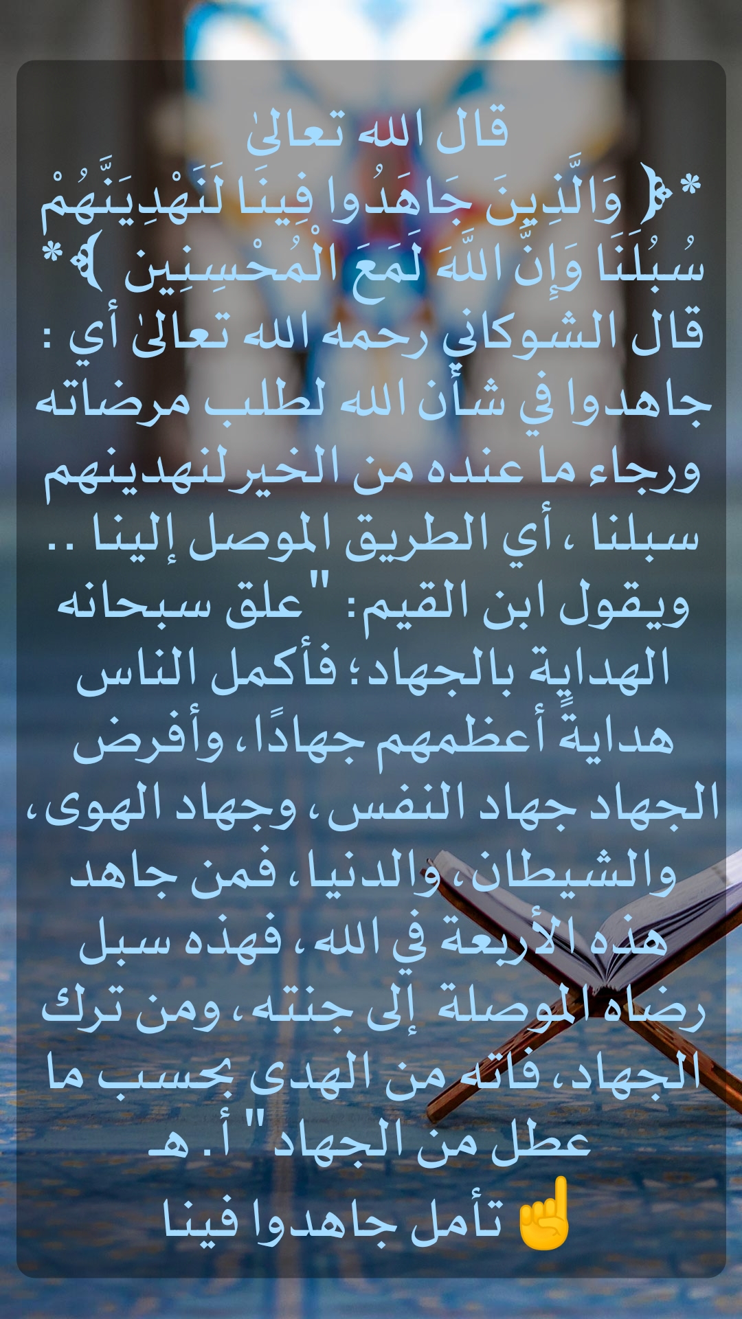 * (وَالَّذِينَ جَاهَدُوا فِينَا لَنَهْدِيَنَّهُمْ سُبُلَنَا وَإِنَّ اللَّهَ لَمَعَ الْمُحْسِنِينَ ) * قال الشوكاني رحمه الله تعالى أي : جاهدوا في شأن الله لطلب مرضاته ورجاء ما عنده من ... المزيد