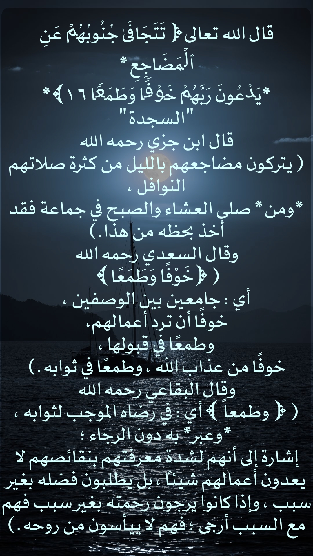 قال الله تعالى (تتجافى جنوبهم عن المَضَاجِعِ يَدْعُونَ رَبَّهُمْ خَوْفًا وَطَمَعًا )