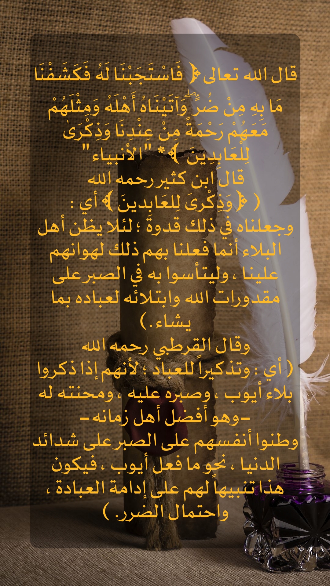 قال الله تعالى ( فَاسْتَجَبْنَا لَهُ فَكَشَفْنَا ما به بِهِ مِنْ ضُرٍّ وَآتَيْنَاهُ أَهْلَهُ وَمِثْلَهُمْ مَعَهُمْ رَحْمَةً مِنْ عِنْدِنَا وَذِكْرَى لِلْعَابِدِينَ ) * قال ابن كثير رحمه الله ( وَذِكْر... المزيد
