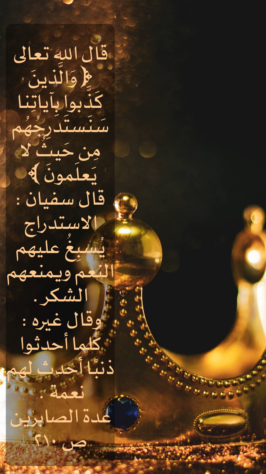 قال الله تعالى( وَالَّذِينَ كَذِبُوا بِآياتنا سنستدرجهم من حيث لا يعلمون ) قال سفيان : الاستدراج يسبغ عليهم النعم ويمنعهم الشكر.