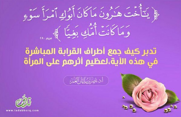 قال الله تعالى : ﴿ يَا أُخْتَ هَارُونَ مَا كَانَ أَبُوكِ امْرَأَ سَوْءٍ وَمَا كَانَتْ أُمُّكِ بَغِيًّا ﴾