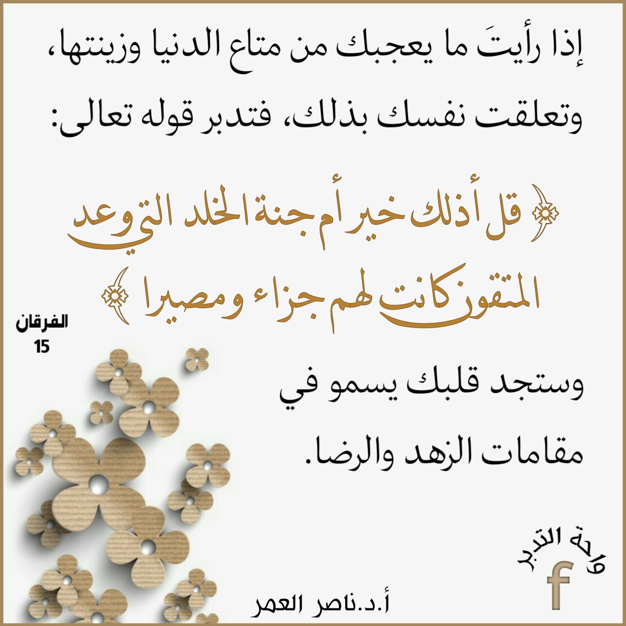 إذا رأيتَ ما يعجبك من متاع الدنيا وزينتها، وتعلقت نفسك بذلك، فتدبر قوله تعالى: (قل أذلك خير أم جنة الخلد التي وعد المتقون كانت لهم جزاء ومصيراً)، وستجد قلبك يسمو في مقامات الزهد والرضا.