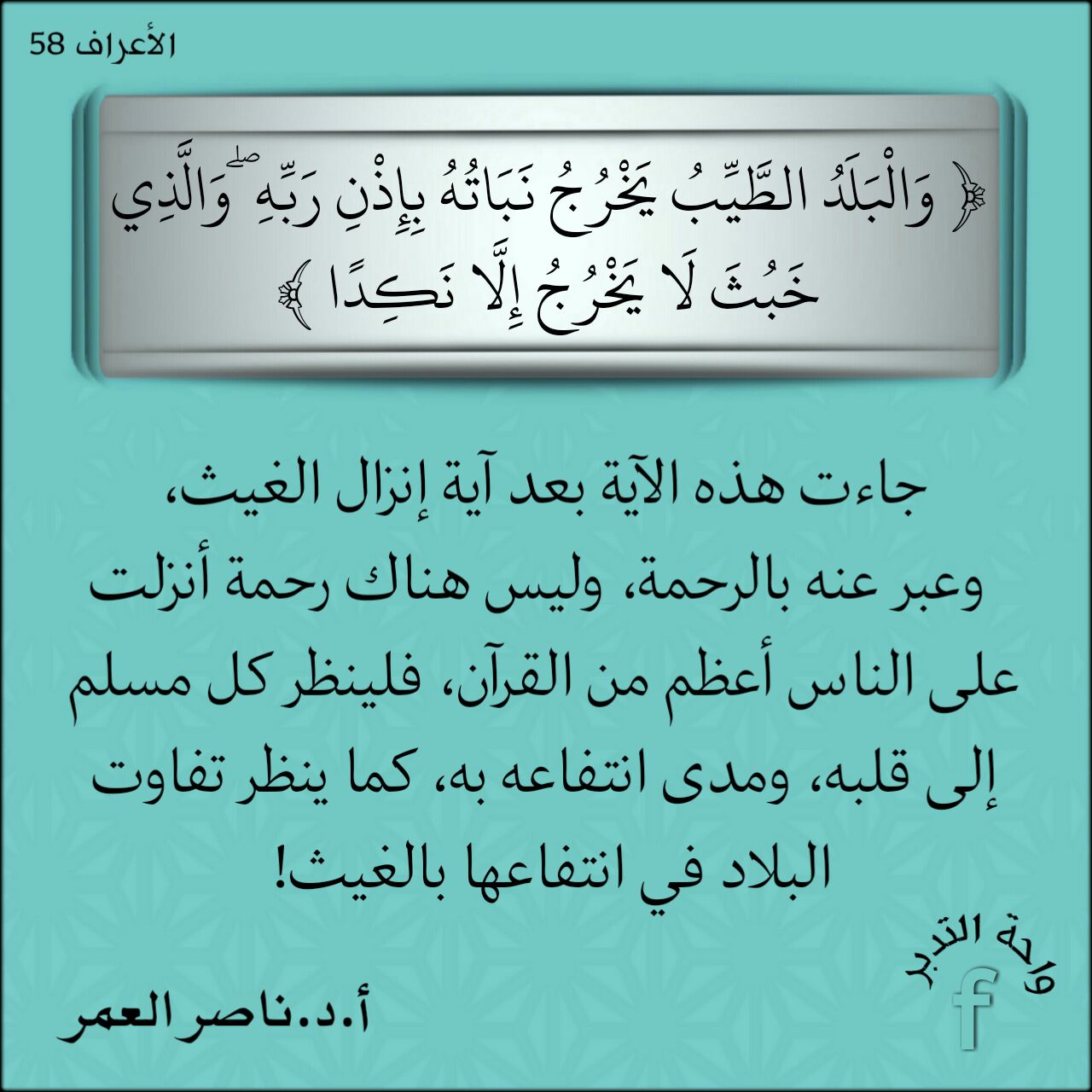 ﴿وَالْبَلَدُ الطَّيِّبُ يَخْرُجُ نَبَاتُهُ بِإِذْنِ رَبِّهِ وَالَّذِي خَبُثَ لَا يَخْرُجُ إِلَّا نَكِدًا﴾: