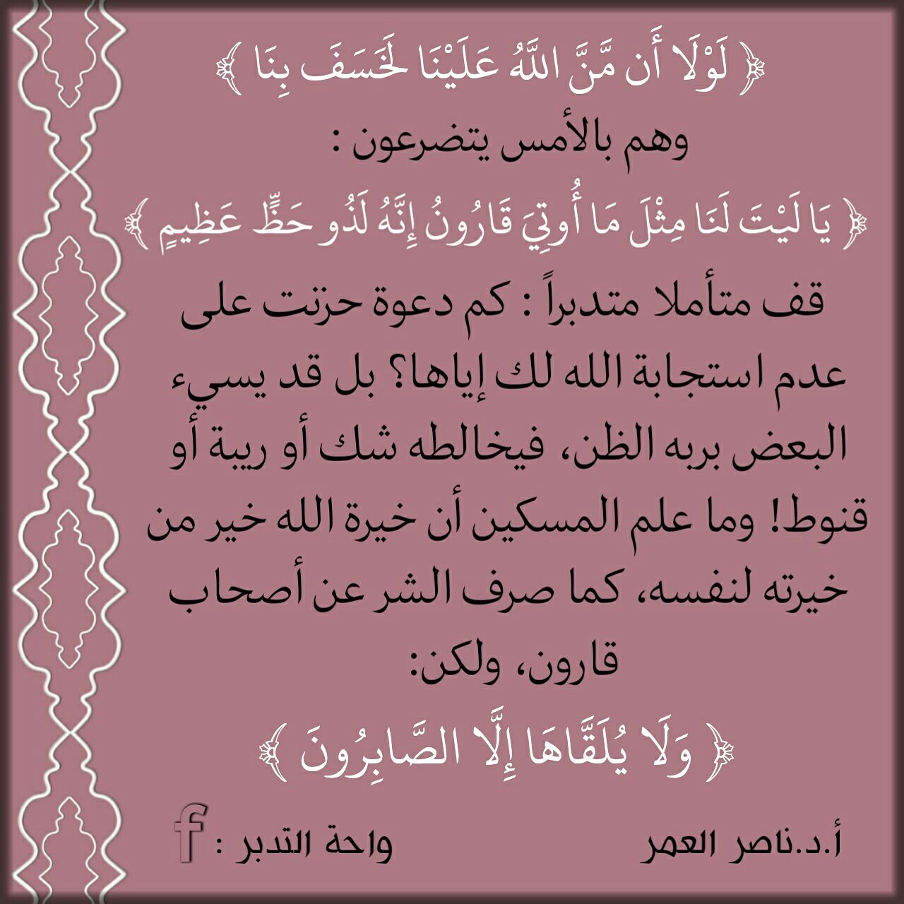 وهم بالأمس يتضرعون: (يَا لَيْتَ لَنَا مِثْلَ مَا أُوتِيَ قَارُونُ إِنَّهُ لَذُو حَظٍّ عَظِيمٍ) قف متأملا متدبراً: كم دعوة حزنت على عدم استجابة ال... المزيد