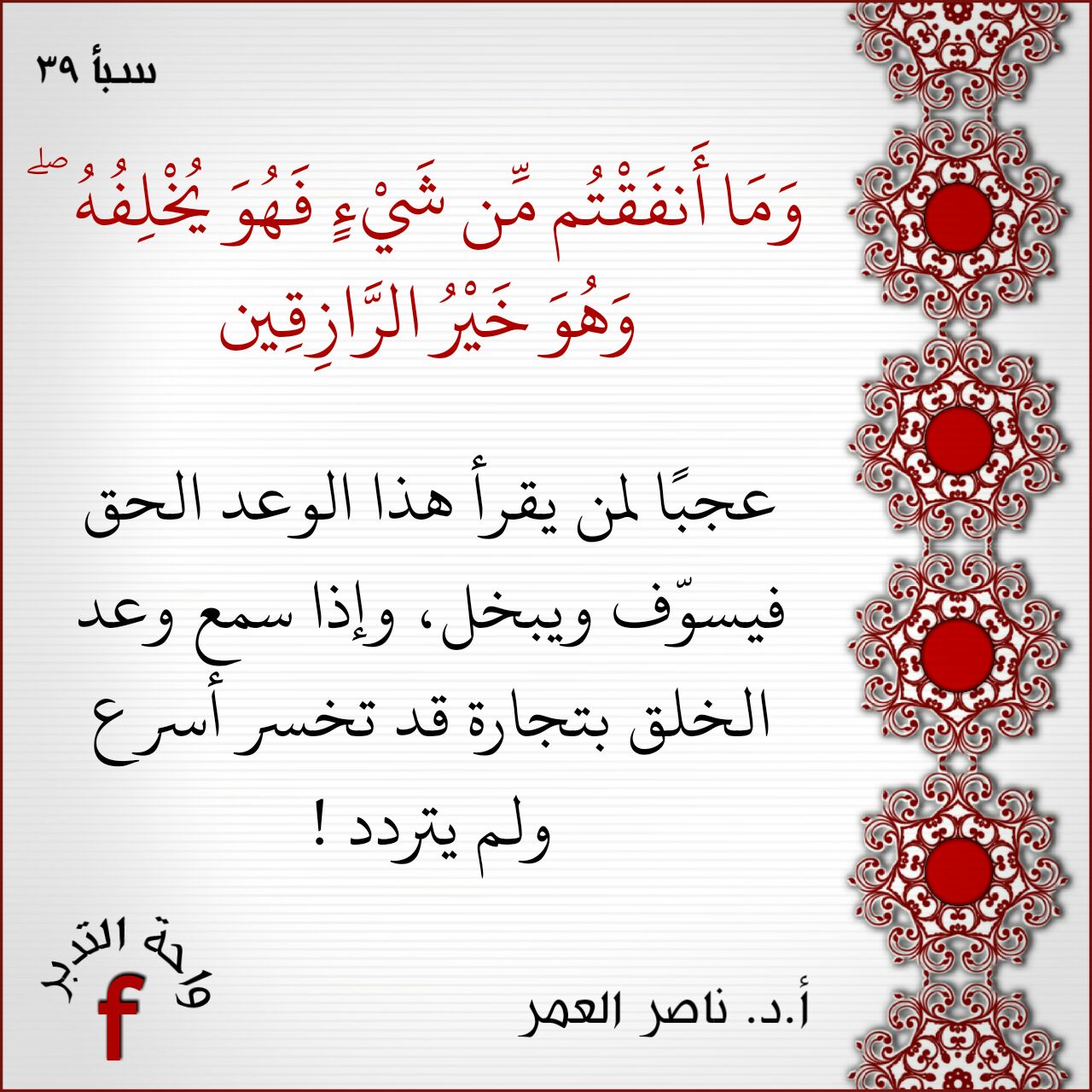 عجبًا لمن يقرأ هذا الوعد الحق فيسوّف ويبخل، وإذا سمع وعد الخلق بتجارة قد تخسر أسرع ولم يتردد!.