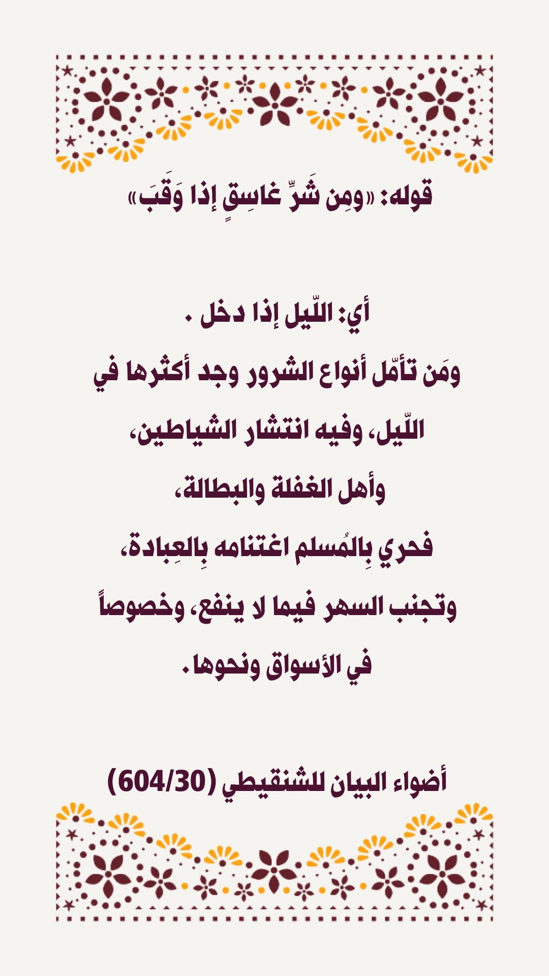 أي: اللّيل إذا دخل. ومَن تأمّل أنواع الشرور وجد أكثرها في اللّيل، وفيه انتشار الشياطين، وأهل الغفلة والبطالة، فحري بِالمُسلم اغتنامه بِالعِبادة، وتجنب السهر فيما لا ينفع، وخصوصاً في الأسواق ونحوها.