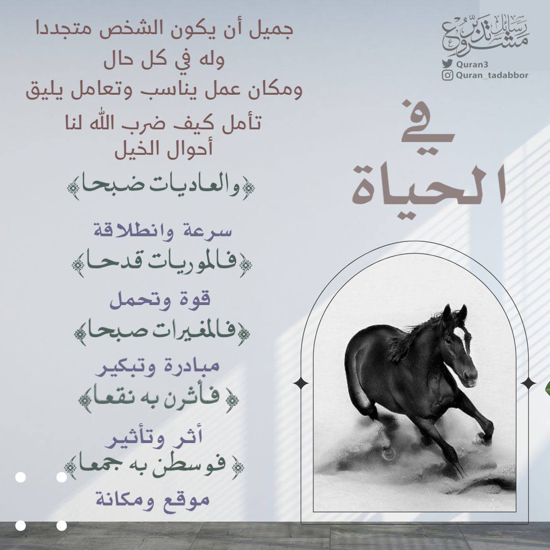 ﴿وَالْعَادِيَاتِ ضَبْحًا • فَالْمُورِيَاتِ قَدْحًا • فَالْمُغِيرَاتِ صُبْحًا • فَأَثَرْنَ بِهِ نَقْعًا • فَوَسَطْنَ بِهِ جَمْعًا﴾
