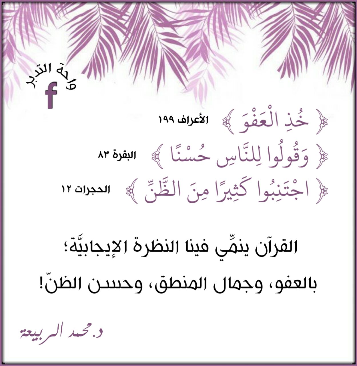 القرآن ينمِّي فينا النظرة الإيجابيَّة؛ بالعفو، وجمال المنطق، وحسن الظنّ!