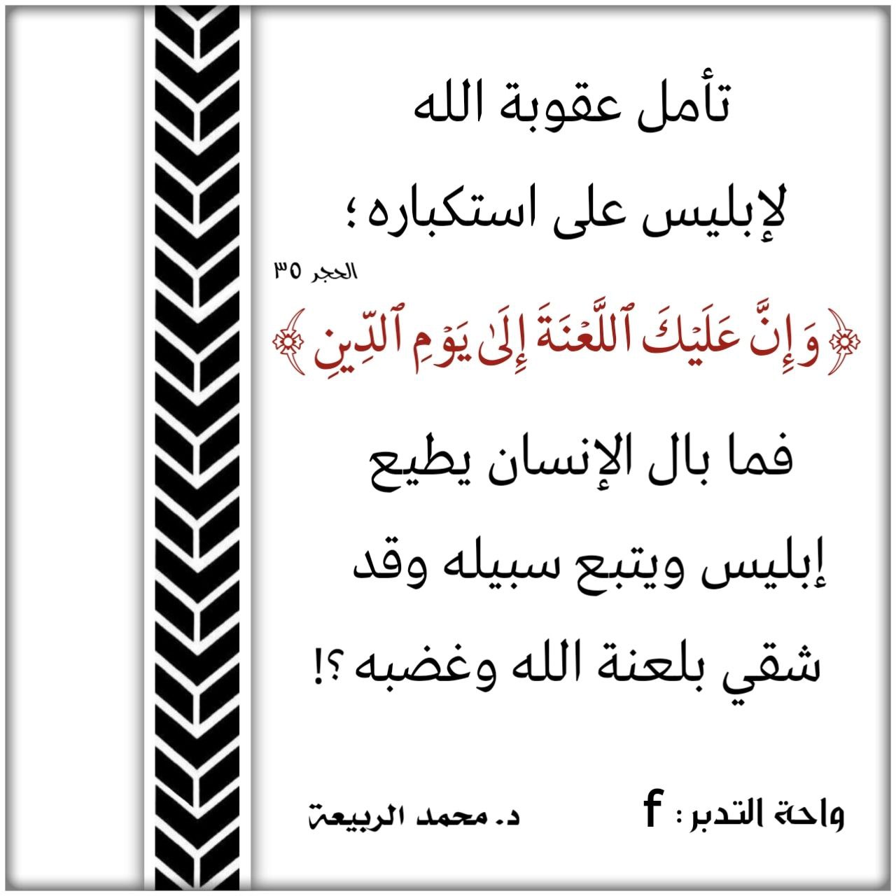 تأمل عقوبة الله لإبليس على استكباره؛ (وَإِنَّ عَلَيْكَ اللَّعْنَةَ إِلَى يَوْمِ الدِّينِ)، فما بال الإنسان يطيع إبليس ويتبع سبيله وقد شقي بلعنة الله وغضبه؟!