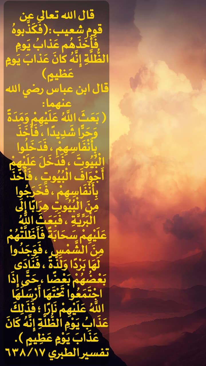﴿فَكَذَّبُوهُ فَأَخَذَهُمْ عَذَابُ يَوْمِ الظُّلَّةِ إِنَّهُ كَانَ عَذَابَ يَوْمٍ عَظِيمٍ﴾