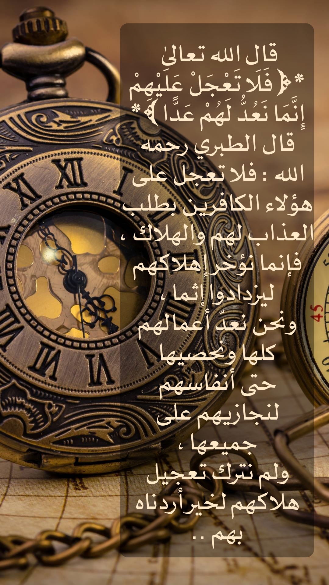 قال الله تعالى * (فَلَا تَعْجَلْ عَلَيْهِمْ إِنَّمَا نَعُدُّ لَهُمْ عَدَّا )* قال الطبري رحمه الله : فلا تعجل على هؤلاء الكافرين بطلب العذاب لهم والهلاك ، فإنما نؤخر إهلاكهم ليزدادوا إثما ونحن نعد أعمالهم كلها ونحصيها حتى أنفاسهم لنجازيهم على جميعها ، ولم نترك تعجيل هلاكهم لخير اردناه بهم..
