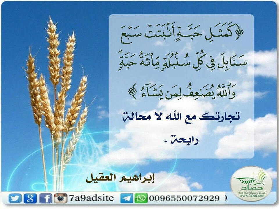 ﴿مثل الذين ينفقون أموالهم في سبيل الله كمثل حبة أنبتت سبع سنابل في كل سنبلة مائة حبة﴾ تجارتك مع الله لا محالة رابحة .