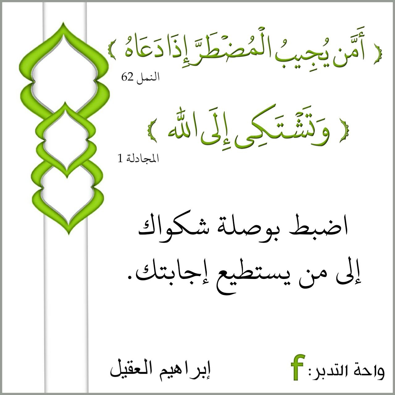 ﴿أَمَّن يُجِيبُ الْمُضْطَرَّ إِذَا دَعَاهُ﴾ ⋄ ﴿وَتَشْتَكِي إِلَى اللَّهِ﴾:
