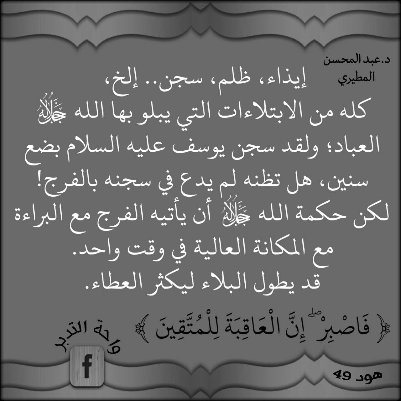 ﴿فَاصْبِرْ إِنَّ الْعَاقِبَةَ لِلْمُتَّقِينَ﴾: