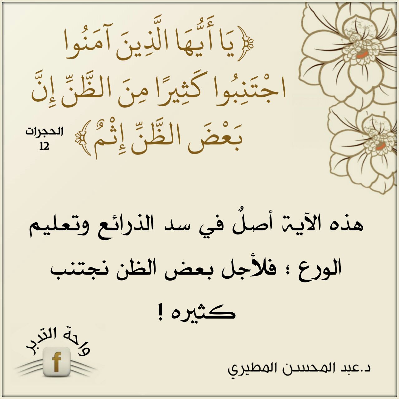 ﴿يَا أَيُّهَا الَّذِينَ آمَنُوا اجْتَنِبُوا كَثِيرًا مِّنَ الظَّنِّ إِنَّ بَعْضَ الظَّنِّ إِثْمٌ﴾: