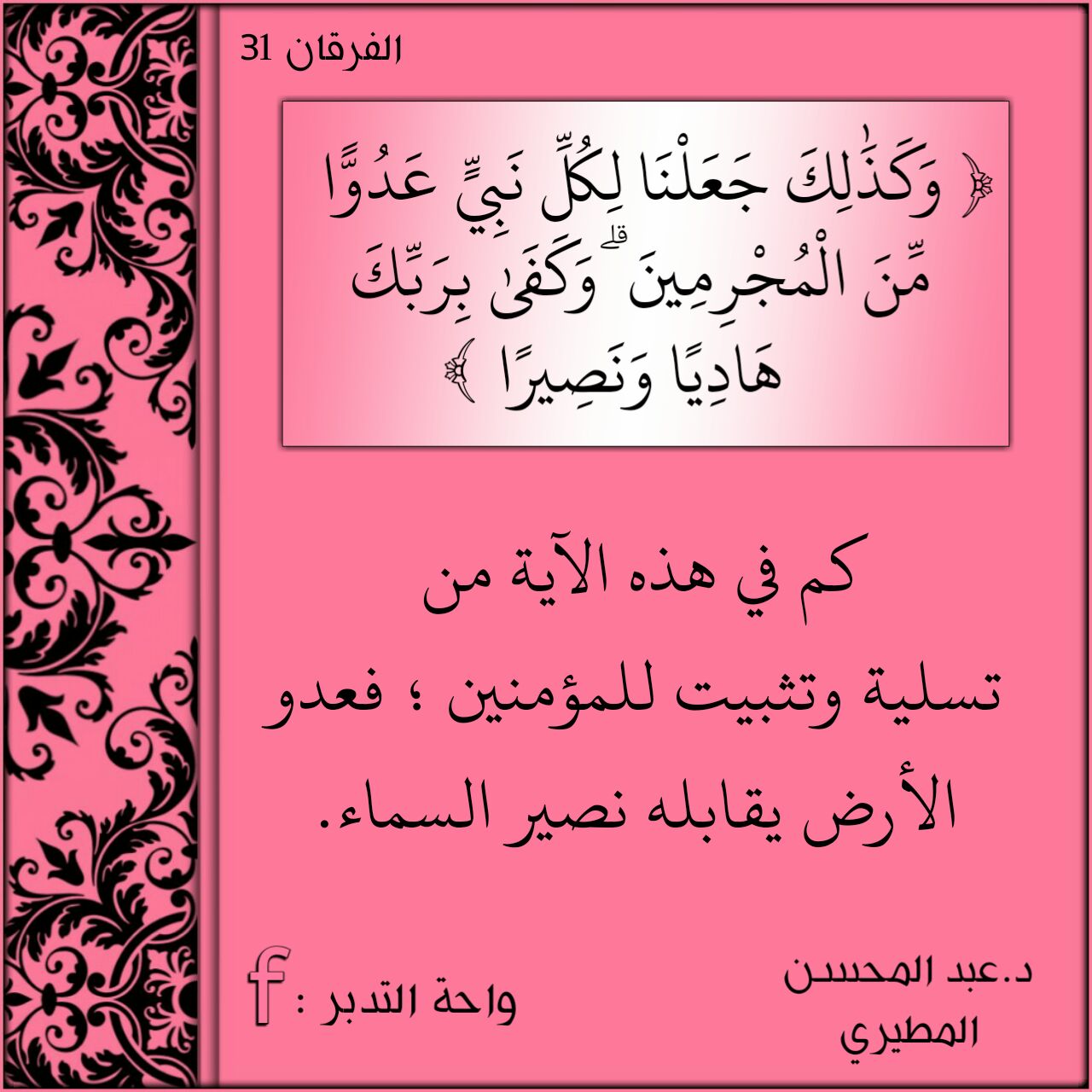 ﴿وَكَذَلِكَ جَعَلْنَا لِكُلِّ نَبِيٍّ عَدُوًّا مِّنَ الْمُجْرِمِينَ وَكَفَى بِرَبِّكَ هَادِيًا وَنَصِيرًا﴾: