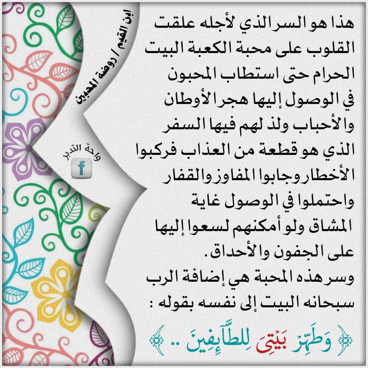 هذا هو السر الذي لأجله علقت القلوب على محبة الكعبة البيت الحرام حتى استطاب المحبون في الوصول إليها هجر الأوطان والأحباب ولذ لهم فيها السفر الذي هو قطعة من العذا... المزيد
