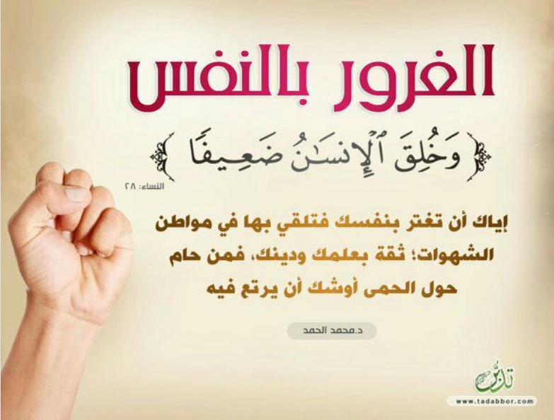 (وَلَوْلَا فَضْلُ اللَّهِ عَلَيْكُمْ وَرَحْمَتُهُ مَا زَكَى مِنْكُمْ مِنْ أَحَدٍ أَبَدًا وَلَكِنَّ اللَّهَ يُزَكِّي مَنْ يَشَاءُ وَاللَّهُ سَمِيعٌ عَلِيمٌ) (النور: ٢١) مَن ذا الذي يُغرِّر بنفسه بعد هذا ثقةً بعلمه، وتديُّنِه، وصبره، دون النظر إلى فضل الله ورحمته؟!