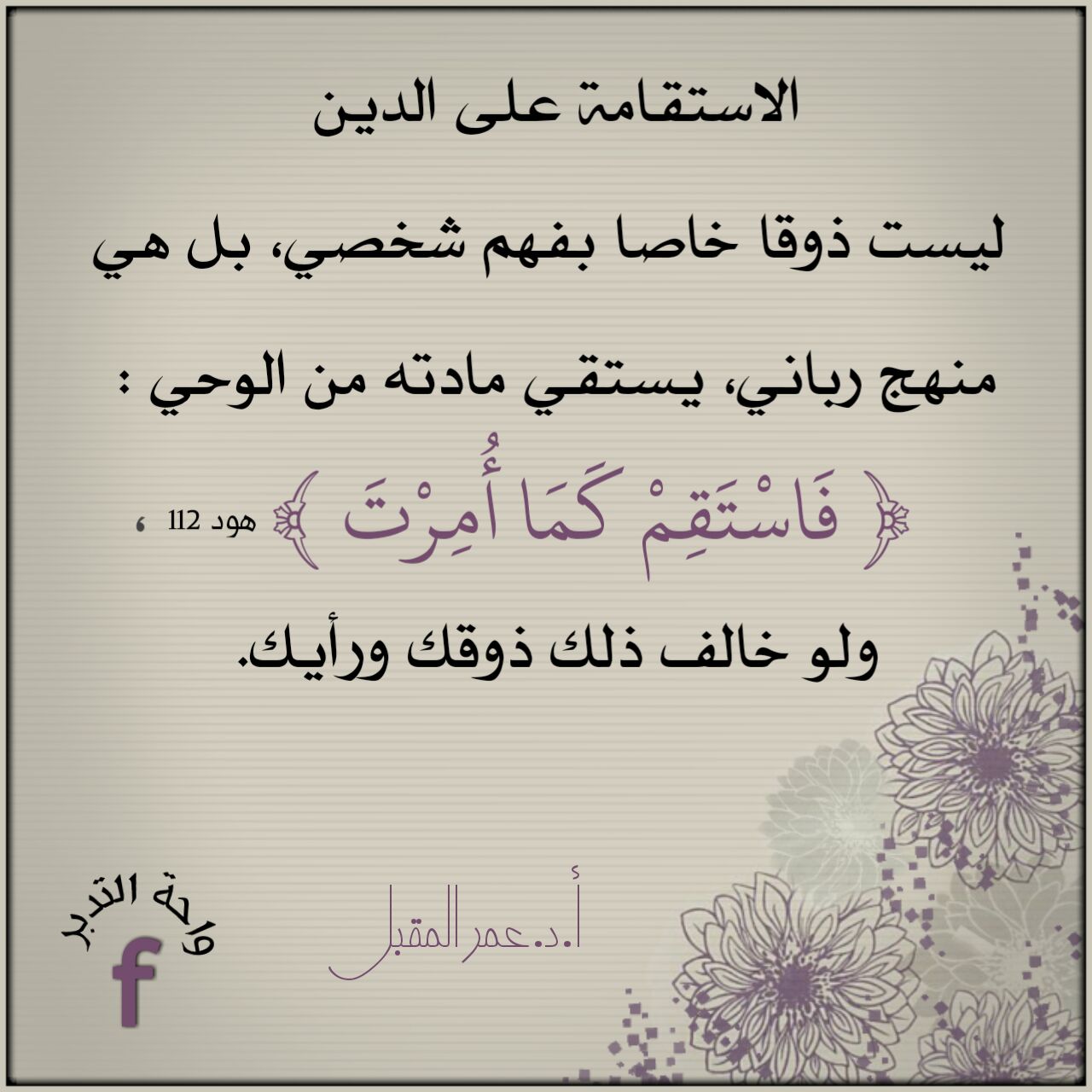 الاستقامة على الدين ليست ذوقا خاصا بفهم شخصي، بل هي منهج رباني، يستقي مادته من الوحي: (فَاسْتَقِمْ كَمَا أُمِرْتَ) ولو خالف ذلك ذوقك ورأيك.