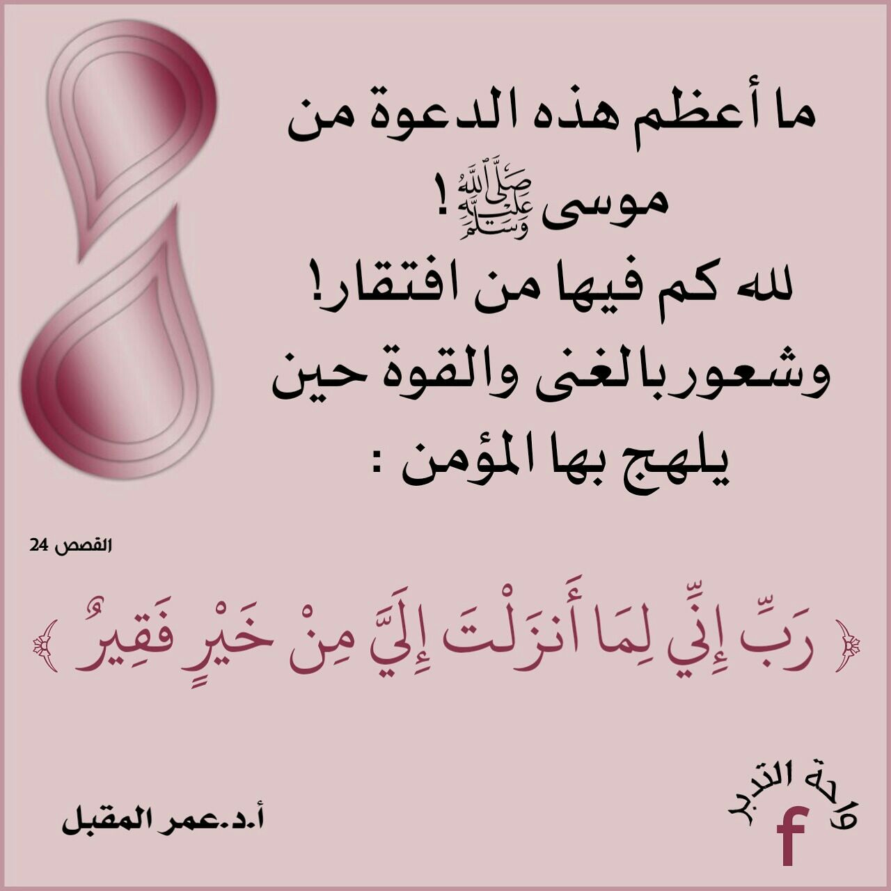 ما أعظم هذه الدعوة من موسى (ﷺ)! لله كم فيها من افتقار! وشعور بالغنى والقوة حين يلهج بها المؤمن: (رَبِّ إِنِّي لِمَا أَنزَلْتَ إِلَيَّ مِنْ خَيْرٍ فَقِيرٌ).
