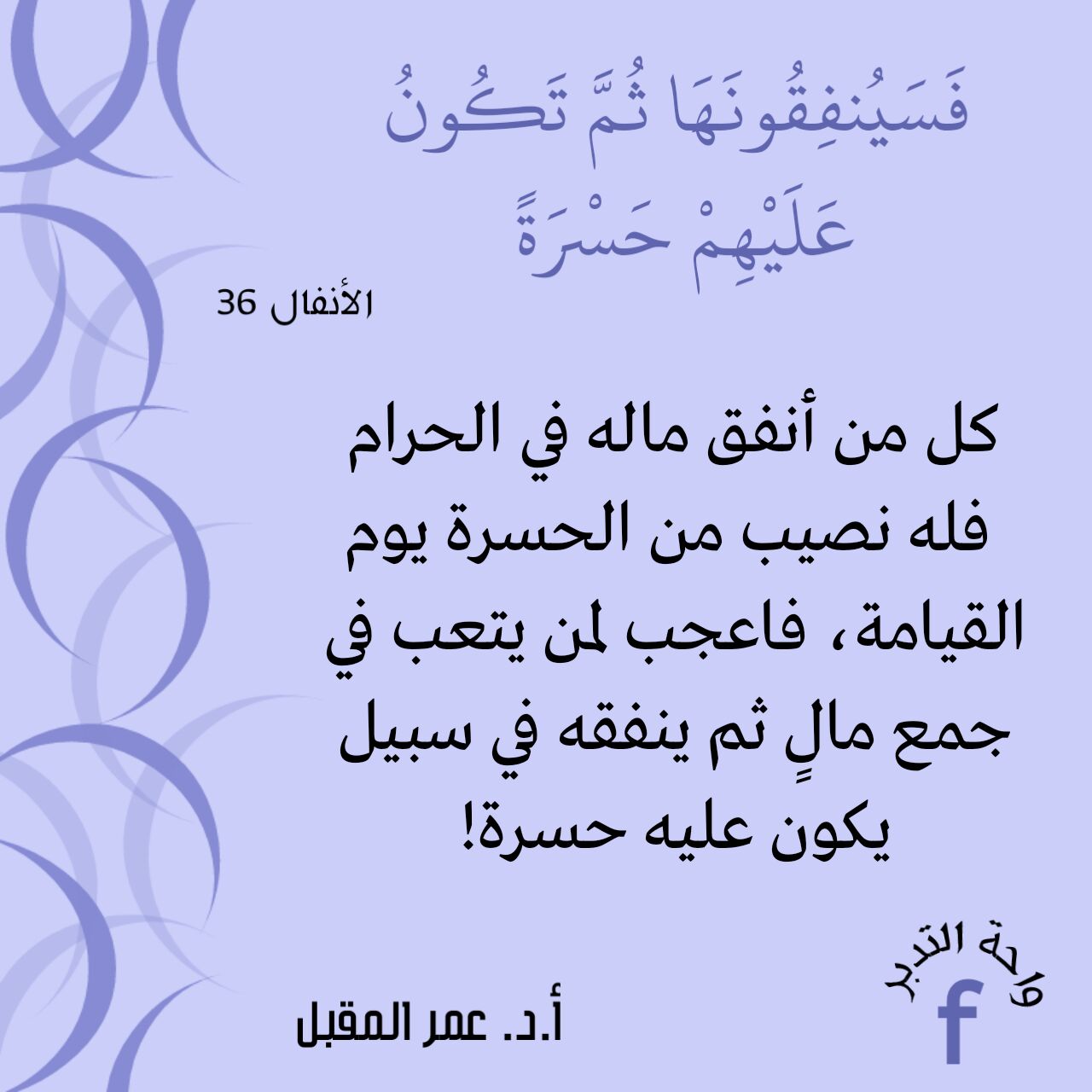 كل من أنفق ماله في الحرام فله نصيب من الحسرة يوم القيامة: (فسينفقونها ثم تكون عليهم حسرة) فاعجب لمن يتعب في جمع مالٍ ثم ينفقه في سبيل يكون عليه حسرة!