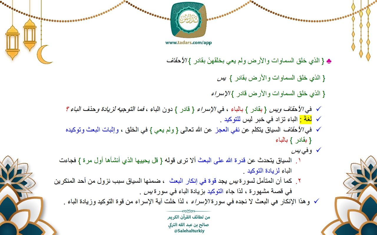- في الأحقاف ويس { بقادر } بالباء ، في الإسراء { قا... المزيد