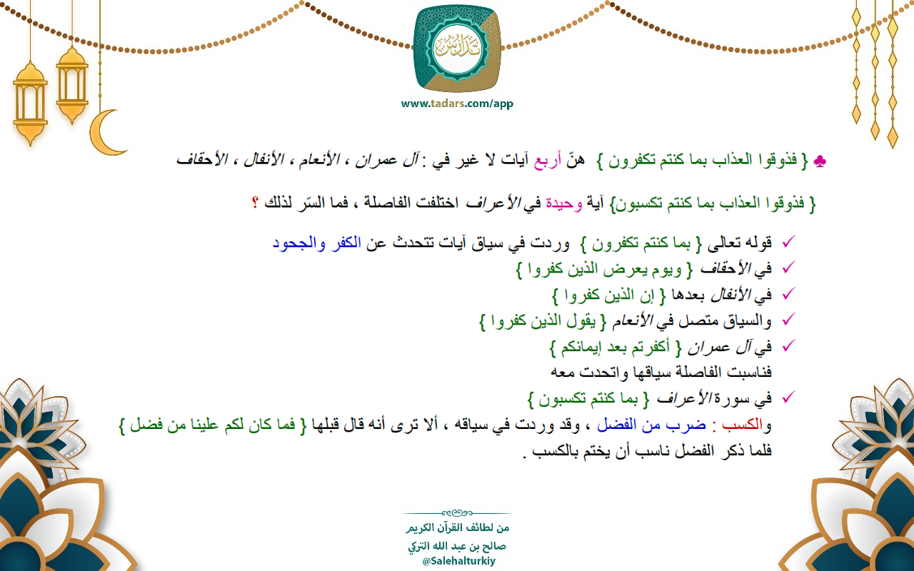 • { فذوقوا العذاب بما كنتم تكفرون } هنّ أربع آيات لا غير في : آل عمران ، الأنعام ، الأنفال ، الأحقاف