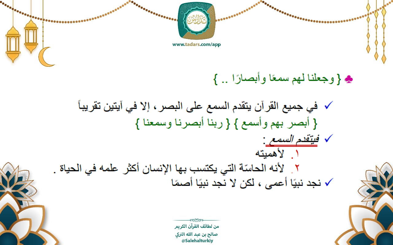 - في جميع القرآن يتقدم السمع على البصر، إلا في آيتين تقريباً { أبصر بهم وأسمع } { ربنا أبصرنا وسم... المزيد