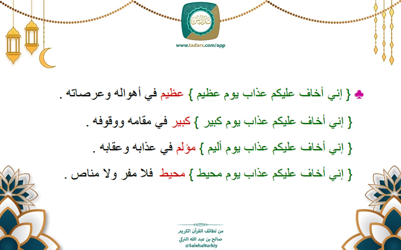 • { إني أخاف عليكم عذاب يوم عظيم } عظيم في أهواله وعرصاته .